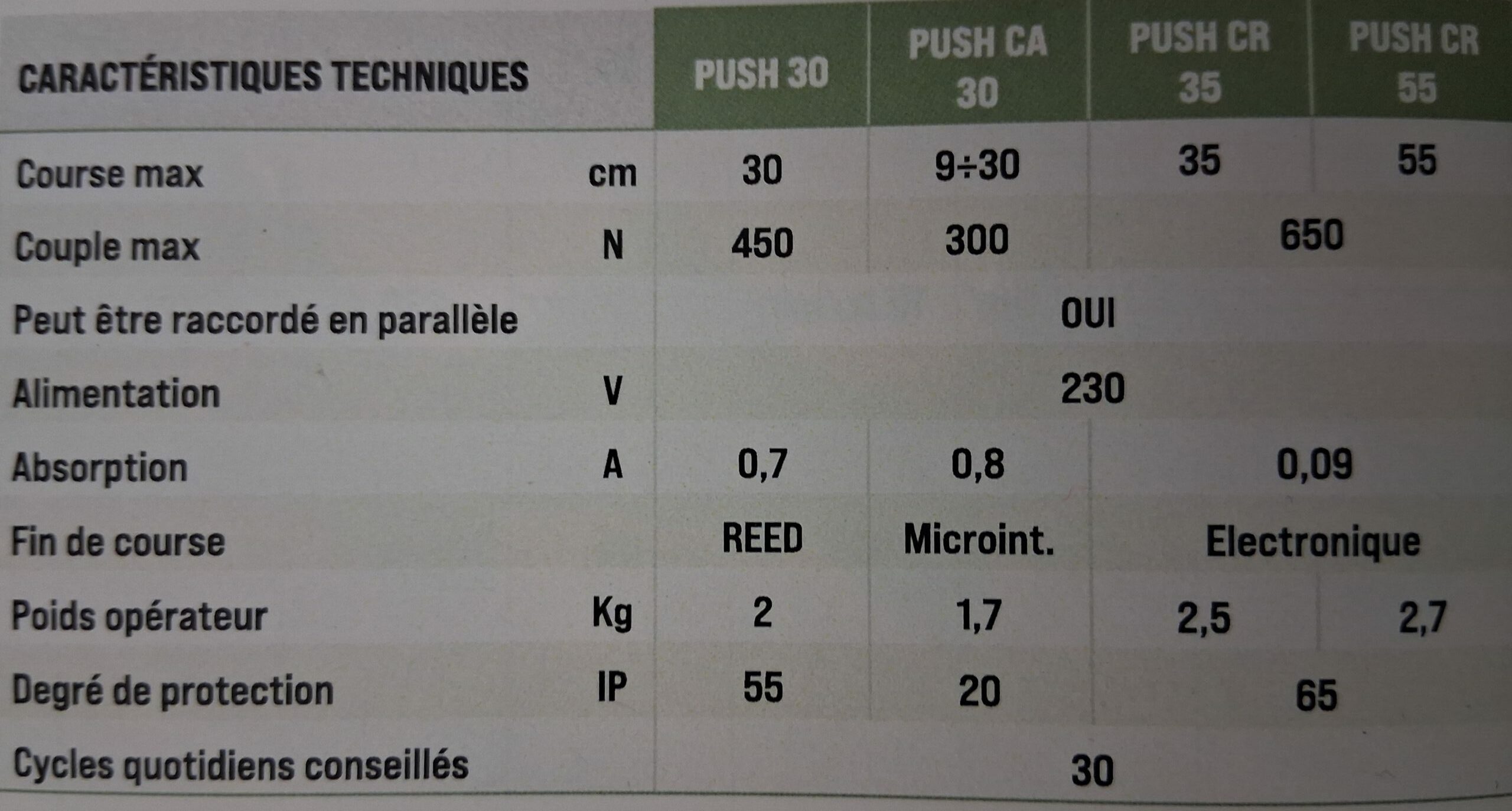 - 3 versions sont disponibles : PUSH 30 (actionneur linéaire à lisse), PUSH CA30 (actionneur à chaîne avec coffre interne), PUSH CR35 (actionneur linéaire à crémaillère)